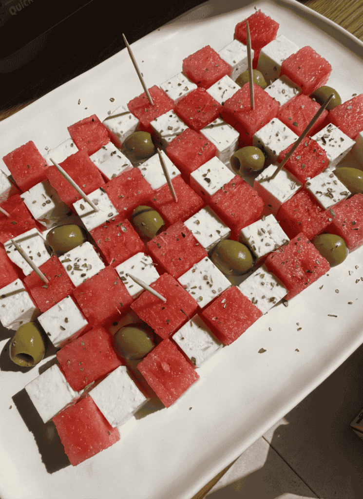 All you need are olives, watermelon and feta, cut into cubes – and they just organize them on a platter. Here is the video: